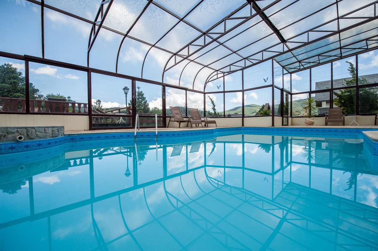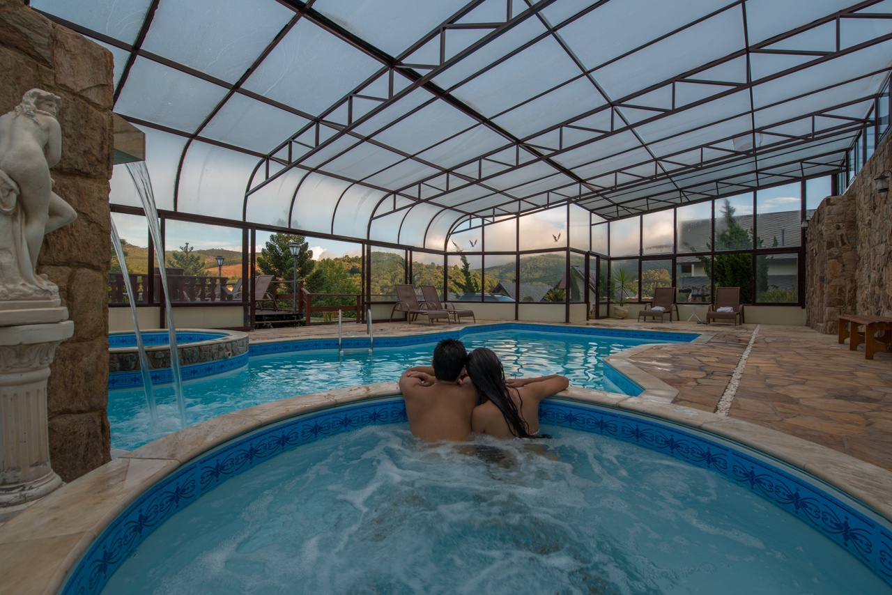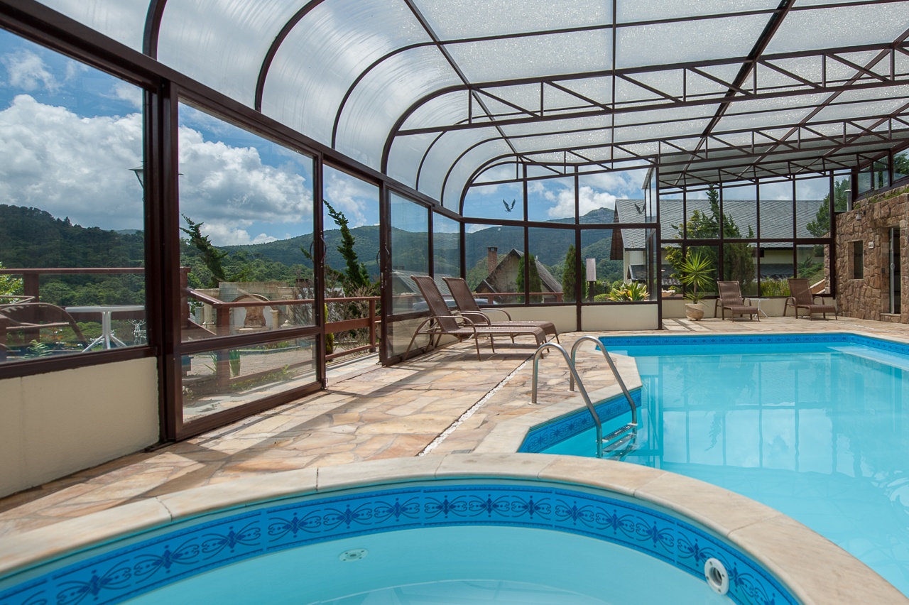 A piscina coberta, em temperatura ambiente, oferece um espaço tranquilo para relaxar e aproveitar momentos de descanso. Localizada ao lado de um deck com espreguiçadeiras e área de estar, proporciona uma atmosféra acolhedora, ideal para quem busca conforto e bem-estar.