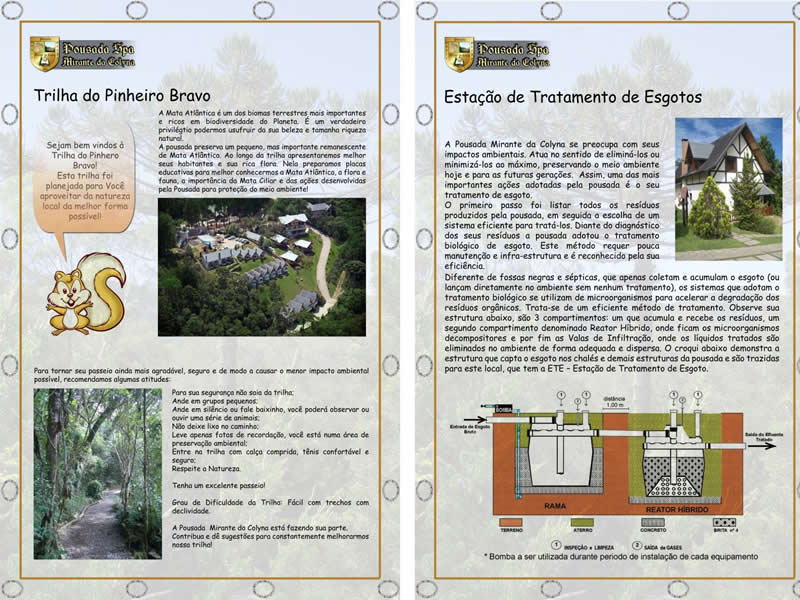 O Hotel Spa Mirante da Colyna iniciou em 2012 o Projeto de estruturação de Trilhas Educativas em meio a Mata Atlântica com o intuito de melhorar a compreensão do ambiente regional, da trilha ecológica do hotel e de seus habitantes. Esperamos que este projeto e toda a estrutura de sinalização das trilhas tragam contribuições para o seu conhecimento e enriqueçam a sua estadia em Monte Verde!